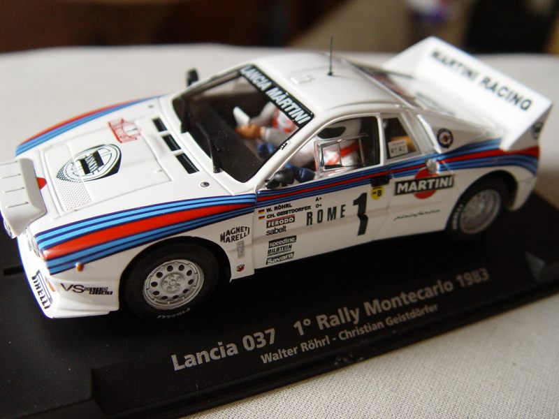 mais elle dois subir une transfo déco et aileron , quand à la r5 pas trop viloent mais rallye , trés belle éclairage , pour la 037 c est ma troisieme , j adore cette voiture configue moteur ar en travers type r5 turbo , trés cool à part les pneus et le moteur , mais bon quand FLY ameliorera ces deux points il s appelerons SLOT IT