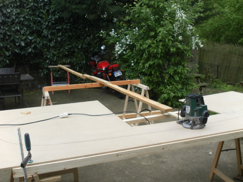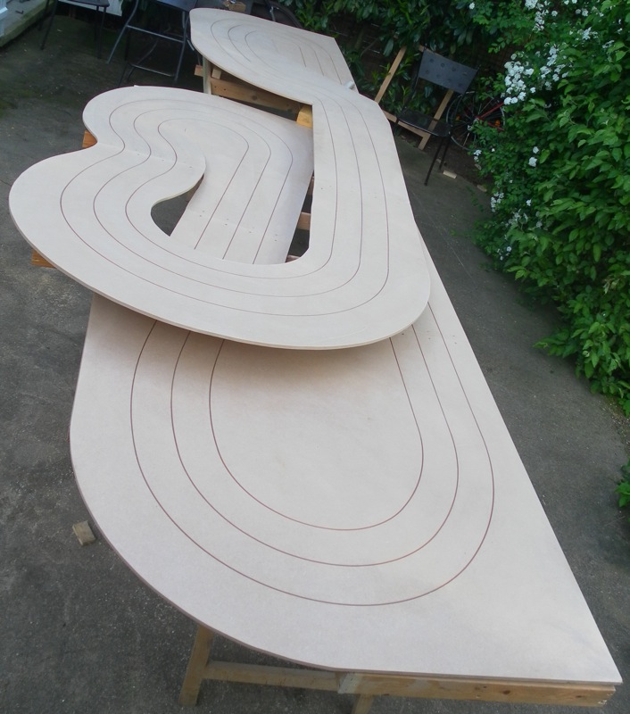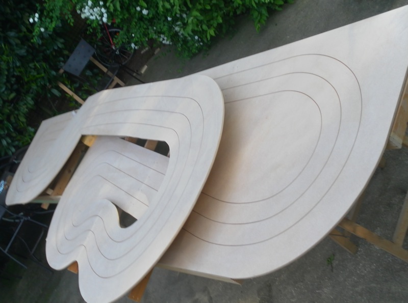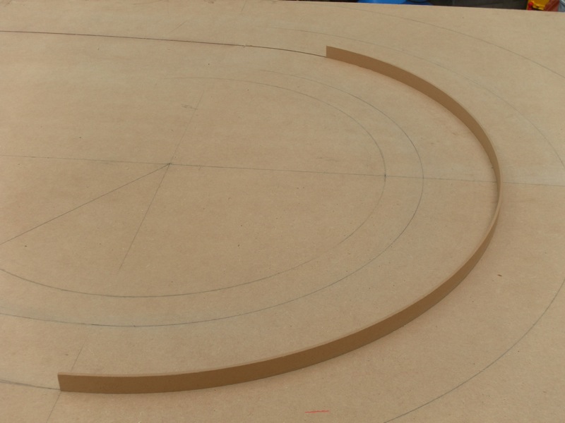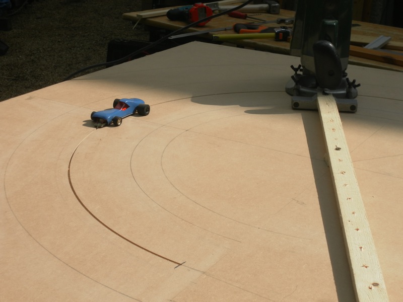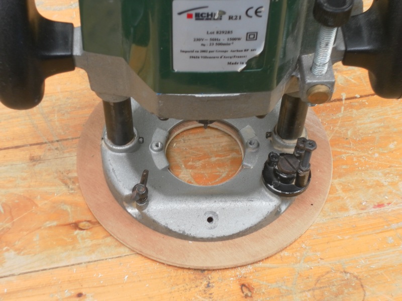 il y a pas mal de temps je m'étais fais une table pour transformer la défonceuse en mini toupie, je m'en suis servis pour faire un disque qui, placé sous la défonceuse, donne le bon écartement entre les voies