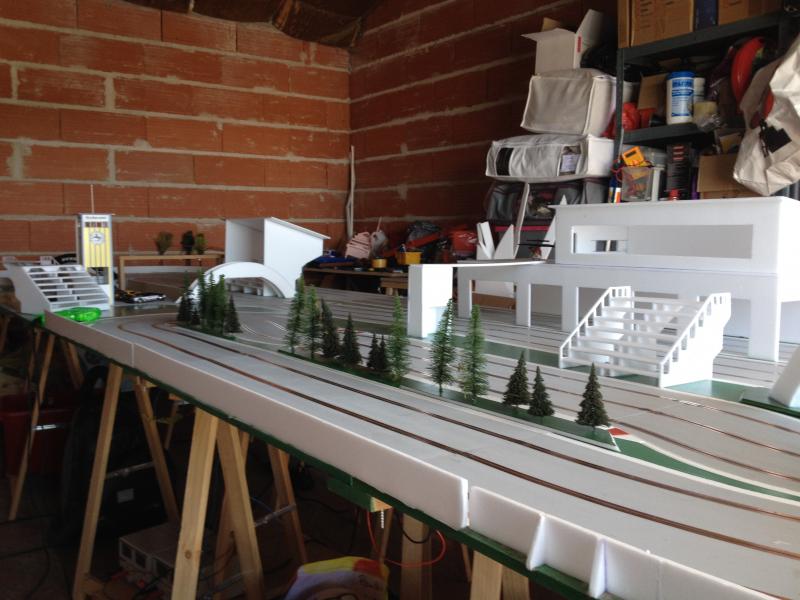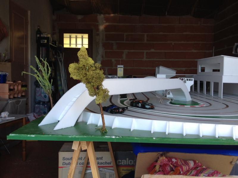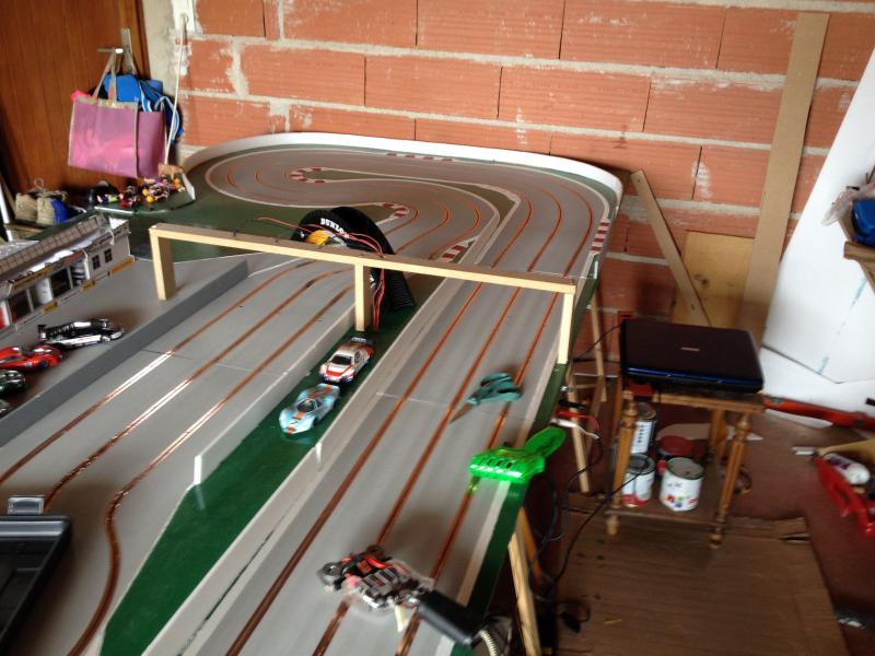 J'ai fait un petit système d'implantation avec un portique (qui sera amélioré plus tard) pour d'abord s'assurer qu'il est fonctionnel d'autant plus que je me suis un peu engagé dans le décors de la piste. Tout deviendra fixe quand je passerai en phase peinture :
