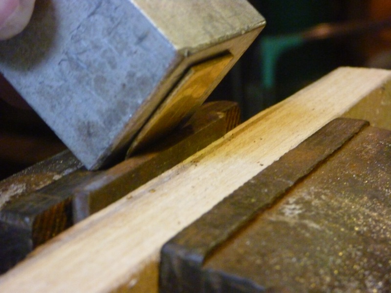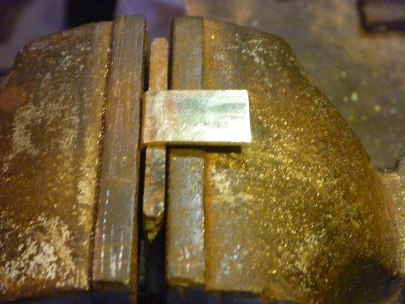 avec, dans mon cas, un bloc d'alu de 3 cm de coté (mais n'importe quelle cale bien droite et plus large que la partie à plier fait l'affaire) plier, avec des petits coups de marteau, la partie qui dépasse du gabarit en faisant attention de rester bien droit