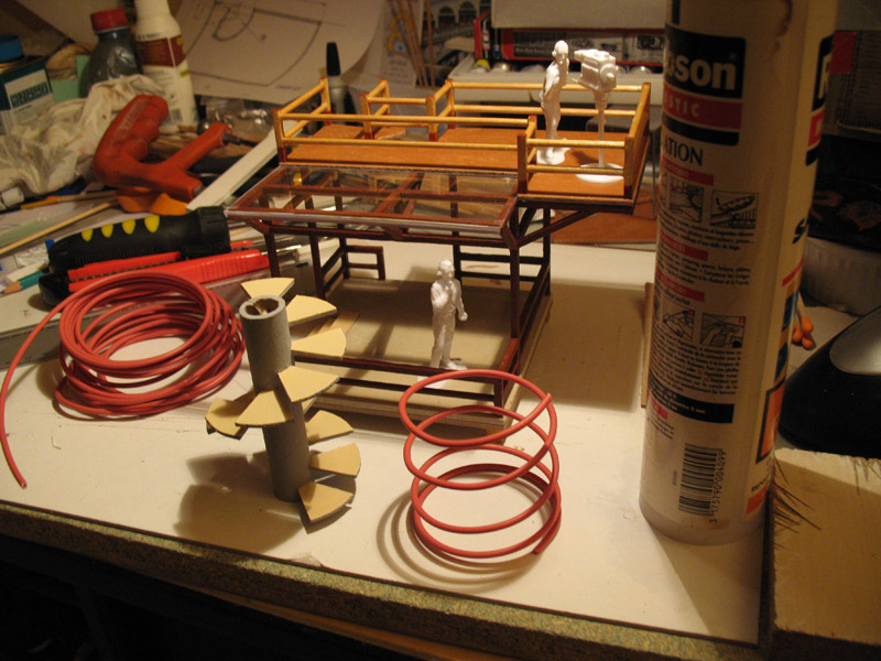 pour la main cou....la rembarde, j'vais essayer ça fil électrique (m...e il est rouge....j'vais encore galérer pour le peindre de la bonne couleur ) mit en forme sur une cartouche (ça fait ressort... c'est impec...bon..;après la fixation.. ....