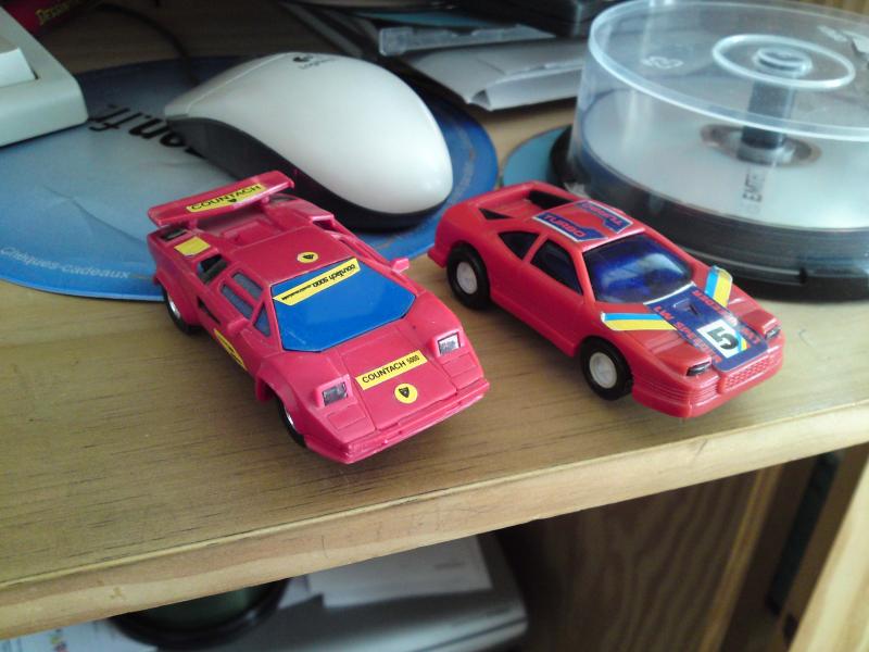 Les 2 monoplaces HO je ne sais pas mais la Lamborghini et la Ferrari ressemble à du Jouef fabriqué par Artin au 1/43 que l'on trouvait dans les hypermarchés à Noël ...