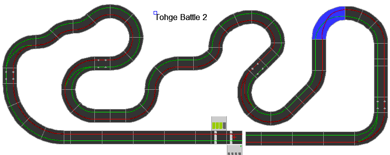 Pour illustration, voici un l'image d'un des meilleurs circuits que j'aie jamais fait, franchement il était super sympa pour l'arsouille. Note bien où est placé le croisement en virage (highlight en bleu). Note bien aussi que s'il était placé dans un autre endroit, on peut se retrouver dans une configuration où on n'a plus accès aux changements de piste. Donc il faut bien réfléchir où placer ce croisement. Mais comme je vois que tu mettrais des changements de piste doubles, pas de soucis pour toi. Je te redis mon avis : reprends ton tout premier circuit, place judicieusement un croisement en virage, un seul. Ne te soucie-pas de la fluidité, les bagnoles d'aujourd'hui accélèrent comme il faut. Et là à toi le bonheur de courses vraiment excitantes !