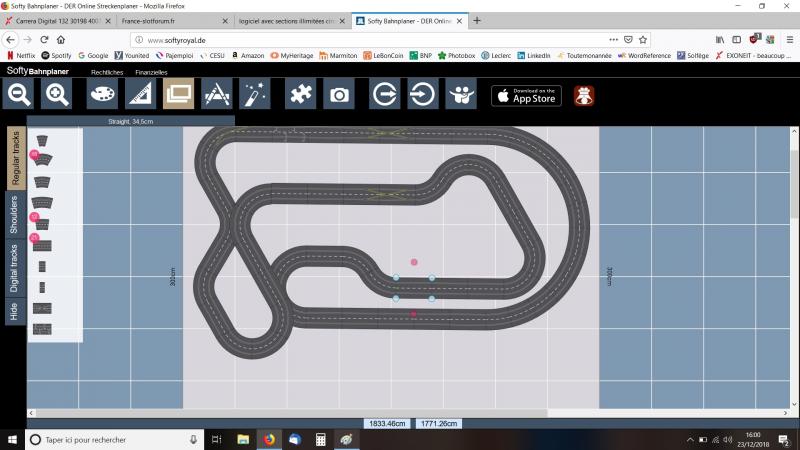 il faut prendre en compte aussi les droites avant et après le virage pour que la piste soit de nouveau correctement posée au sol et puis les bordures... l'encombrement est pas negligeable, surtout en Carrera.
