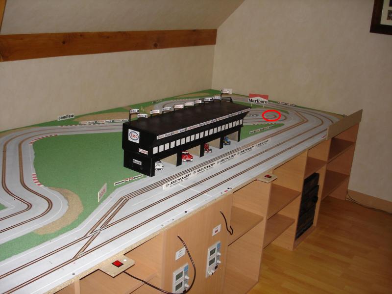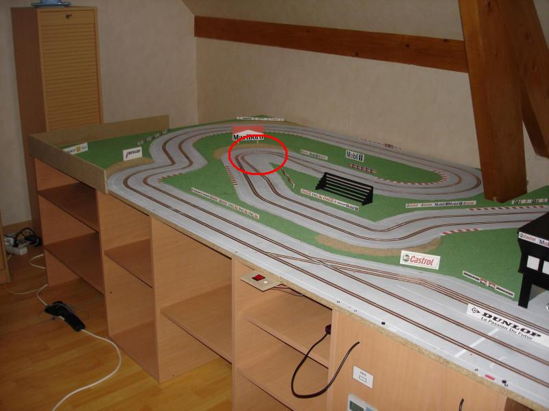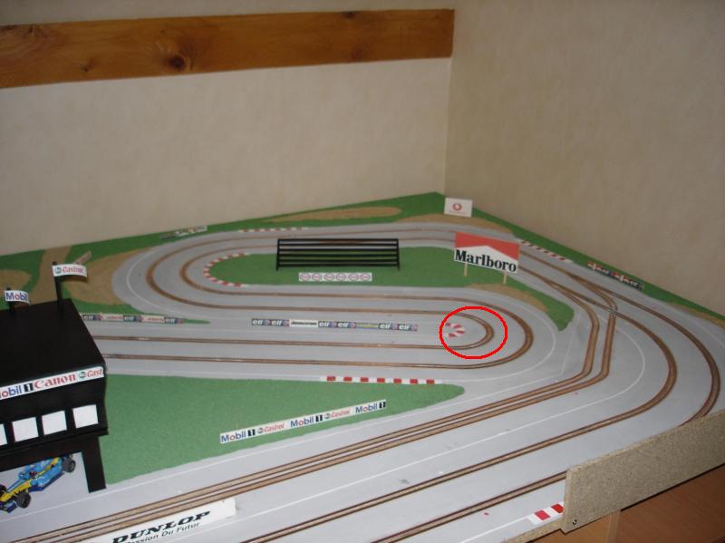 Salut a tous. Je viens vers vous pour vous demander votre avis sur une modif que j'hesite a faire sur mon tracé bois. J'ai fais tracé de Barcelone et mes 2 voies sont a quasiment identiques en terme de temps. Cependant sur une des 2 voies, j'ai 1 virage assez raide ( 9 cm rayon ). Ca passe encore assez facilement ( enfin faut bien doser le freinage car sinon tout droit et la reacceleration ) mais le probleme c'est que sur voie 1 en roulant bien on ne sort pas de la piste alors que sur la voie 2, 1 fois sur 10 on sors a cet endroit là. J'avais deja refais un virage ( voir premiere photo ) et a cet endroit les voitures ne peuvent plus etre cote a cote. Pour l'instant il n'y a que celui là donc ce n'est pâs genant et comme le 2° virage est assez proche de celui là, j'ai peur que ca gene lorsqu'on est cul a cul, enfin qu'une voiture soit comme pour le premier obliger de laisser passer l'autre .