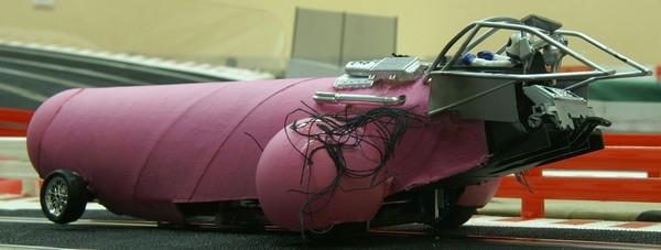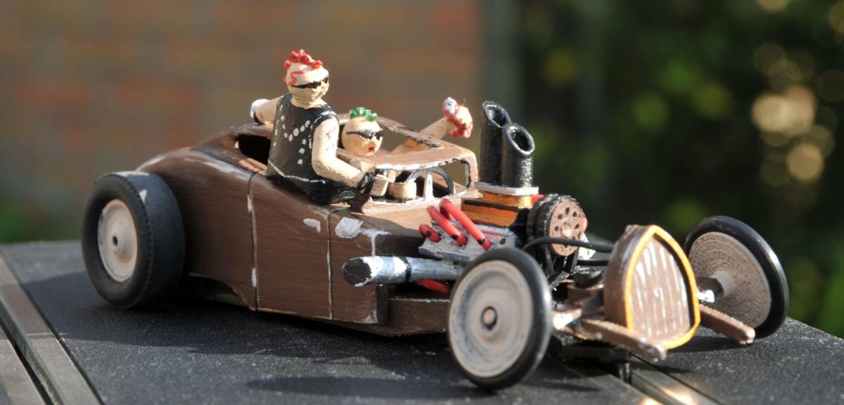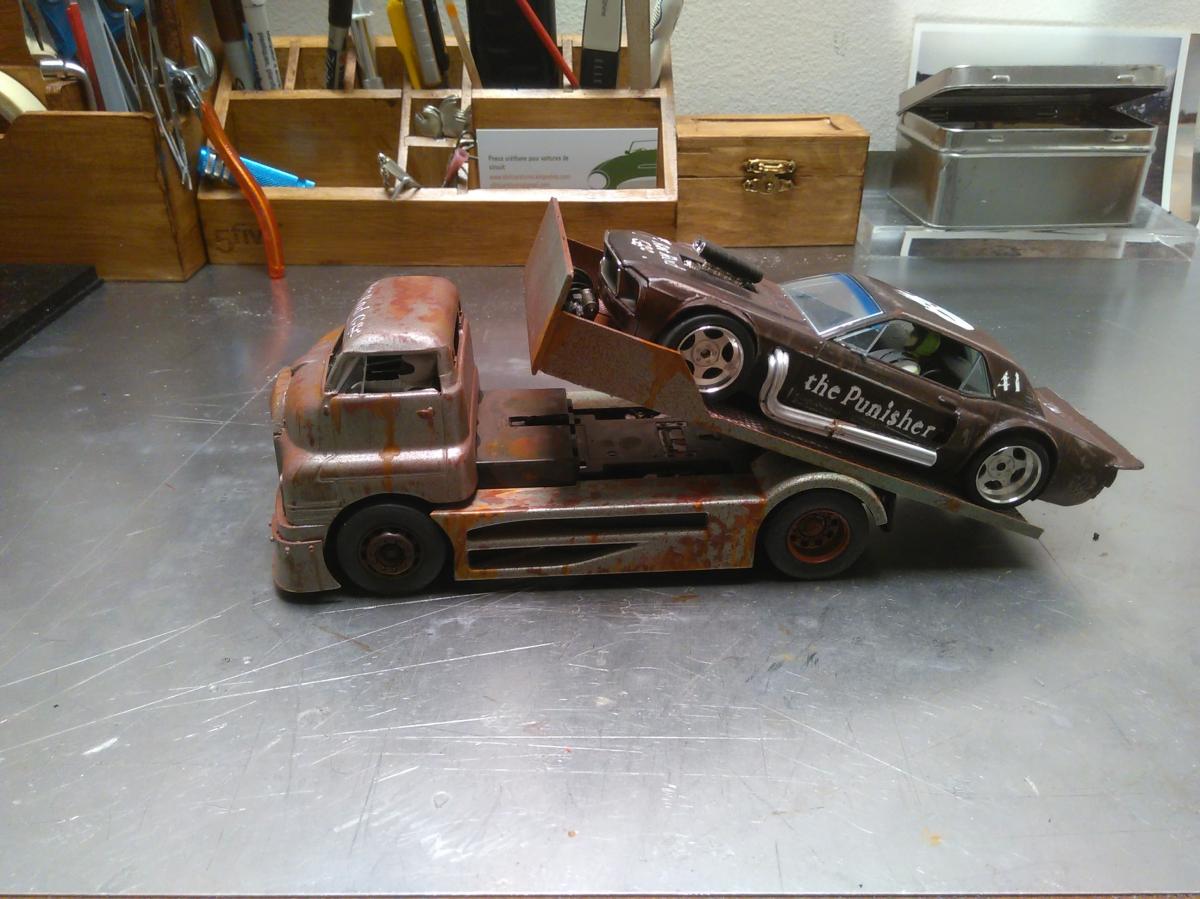 Défit réussit ! Je le trouve très sympa ce Rat Rod, sacré effort sur les personnages. C'est vrai que maintenant tu as largement amélioré tes fabrications, mais on appréciera le travail de peinture. Tu m'as l'air d'avoir une épouse très éclectique en matière d'automobile. Bravo Madame.